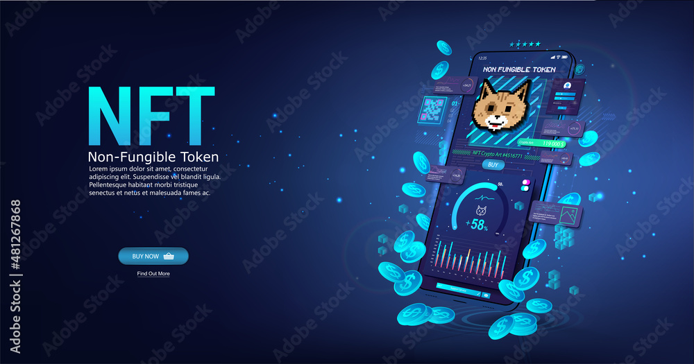 Buy Nft Crypto Token With Mobile Phone App Banner Non Fungible Token And Smartphone With App For Buying Crypto Arts Nft Token In Blockchain Technology 3d Illustration Crypto Art Application Vector Stock Vector